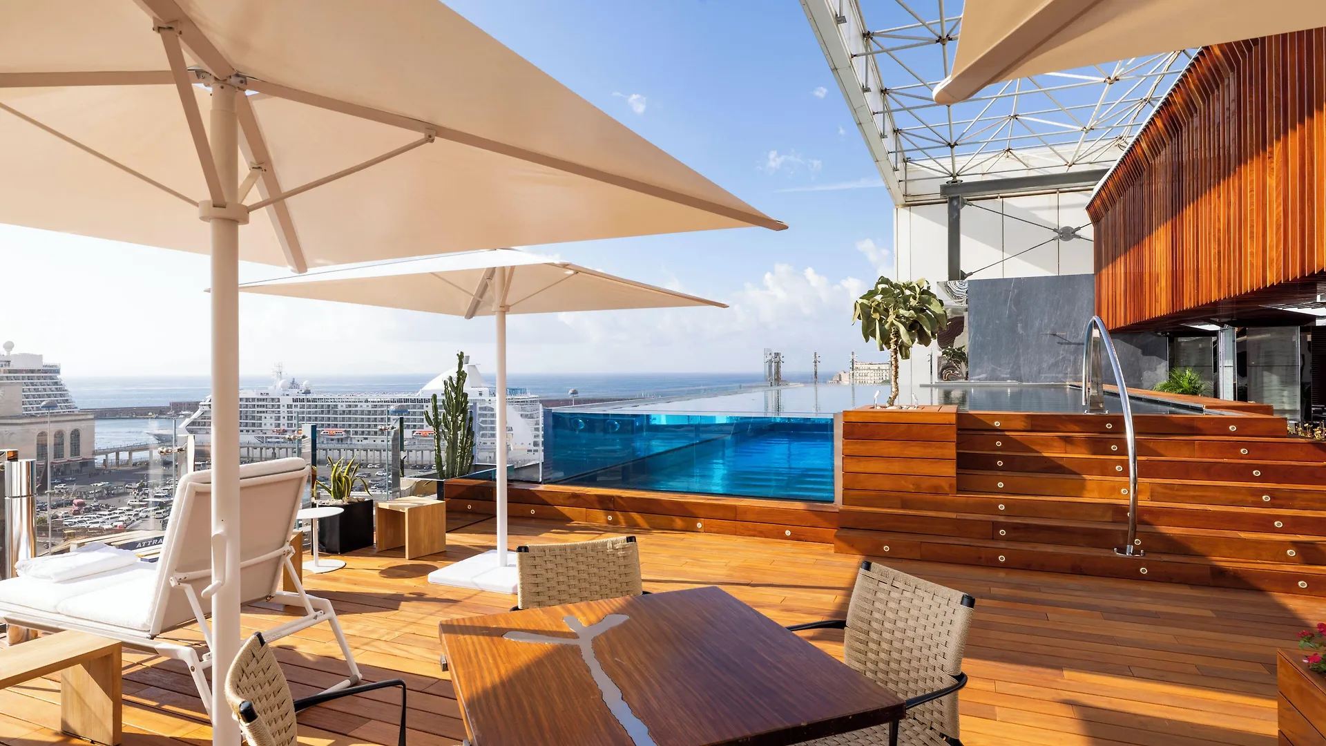 Gli ospiti possono allenarsi nel centro fitness o rilassarsi a bordo di una piscina panoramica.